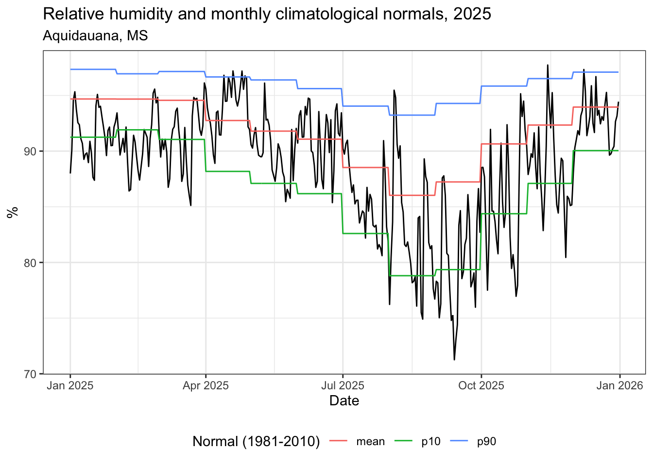 The {climindi} package computes the average, 10th and 90th percentile as climatological normals.