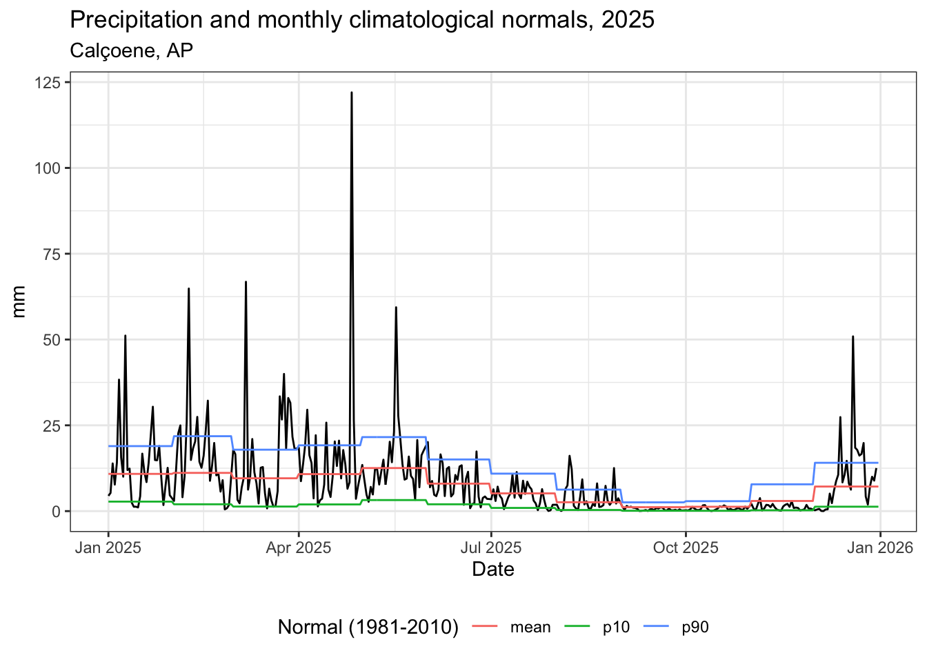 count Count of data pointsmean Mean valuemedian Mediansd Standard deviationse Standard errormax Maximum valuemin Minimum valuep10 10th percentilep25 25th percentilep75 75th percentilep90 90th percentilers3 Rain spells: count of rain spells occurrences, with 3 and 5 or more consecutive days with rain above the climatological normal average valuep_1 Count of days with precipitation above 1mmp_5 Count of days with precipitation above 5mmp_10 Count of days with precipitation above 10mmp_50 Count of days with precipitation above 50mmp_100 Count of days with precipitation above 100mmd_3 Count of sequences of 3 days or more without precipitationd_5 Count of sequences of 5 days or more without precipitationd_10 Count of sequences of 10 days or more without precipitationd_15 Count of sequences of 15 days or more without precipitationd_20 Count of sequences of 20 days or more without precipitationd_25 Count of sequences of 25 days or more without precipitationhw3 Count of heat waves occurrences with 3 or more consecutive days with maximum temperature above the climatological normal value plus 5 Celsius degreeshw5 Count of heat waves occurrences with 5 or more consecutive days with maximum temperature above the climatological normal value plus 5 Celsius degreeshot_days Count of hot days, when the maximum temperature is above the normal 90th percentilet_25 Count of days with temperatures above or equal to 25 Celsius degreest_30 Count of days with temperatures above or equal to 30 Celsius degreest_35 Count of days with temperatures above or equal to 35 Celsius degreest_40 Count of days with temperatures above or equal to 40 Celsius degreescw3 Count of cold spells occurrences with 3 or more consecutive days with minimum temperature bellow the climatological normal value minus 5 Celsius degreescw5 Count of cold spells occurrences with 5 or more consecutive days with minimum temperature bellow the climatological normal value minus 5 Celsius degreescold_days Count of cold days, when the minimum temperature is bellow the normal 10th percentilet_0 Count of days with temperatures bellow or equal to 0 Celsius degreest_5 Count of days with temperatures bellow or equal to 5 Celsius degreest_10 Count of days with temperatures bellow or equal to 10 Celsius degreest_15 Count of days with temperatures bellow or equal to 15 Celsius degreest_20 Count of days with temperatures bellow or equal to 20 Celsius degreesds3 Count of dry spells occurrences with 3 or more consecutive days with relative humidity bellow the climatological normal value minus 10 percentds5 Count of dry spells occurrences with 5 or more consecutive days with relative humidity bellow the climatological normal value minus 10 percentws3 Count of wet spells occurrences with 3 or more consecutive days with relative humidity above the climatological normal value plus 10 percentws5 Count of wet spells occurrences with 5 or more consecutive days with relative humidity above the climatological normal value plus 10 percentdry_days Count of dry days, when the relative humidity is bellow the normal 10th percentilewet_days Count of wet days, when the relative humidity is above the normal 90th percentileh_21_30 Count of days with relative humidity between 21% and 30% (Attention level)h_12_20 Count of days with relative humidity between 12% and 20% (Alert level)h_11 Count of days with relative humidity bellow 12% (Emergence level)l_eto_3 Count of sequences of 3 or more consecutive days with wind speed bellow the climatological average normall_eto_5 Count of sequences of 5 or more consecutive days with wind speed bellow the climatological average normalh_eto_3 Count of sequences of 3 or more consecutive days with wind speed above the climatological average normalh_eto_5 Count of sequences of 5 or more consecutive days with wind speed above the climatological average normalb1 Count of days classified as level 1 on Beaufort scaleb2 Count of days classified as level 2 on Beaufort scaleb3 Count of days classified as level 3 on Beaufort scaleb4 Count of days classified as level 4 on Beaufort scaleb5 Count of days classified as level 5 on Beaufort scaleb6 Count of days classified as level 6 on Beaufort scaleb7 Count of days classified as level 7 on Beaufort scaleb8 Count of days classified as level 8 on Beaufort scaleb9 Count of days classified as level 9 on Beaufort scaleb10 Count of days classified as level 10 on Beaufort scaleb11 Count of days classified as level 11 on Beaufort scaleb12 Count of days classified as level 12 on Beaufort scaleThe package functions needs data in specific units. Please certify that your data is in the required unit before running the functions.