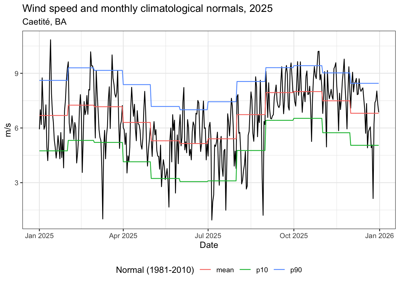 title = "Wind speed and monthly climatological normals, 2025",