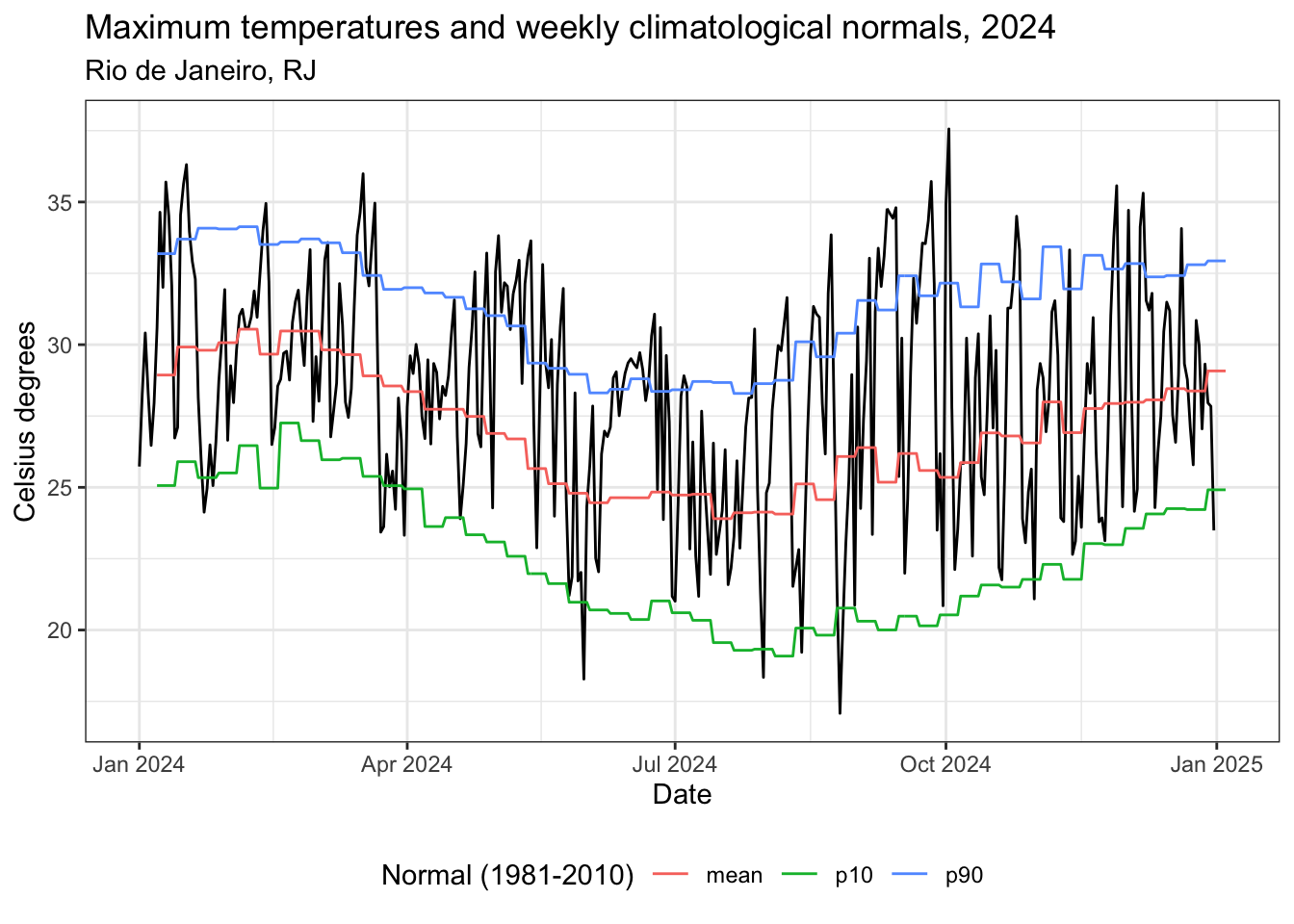 title = "Maximum temperatures and monthly climatological normals",