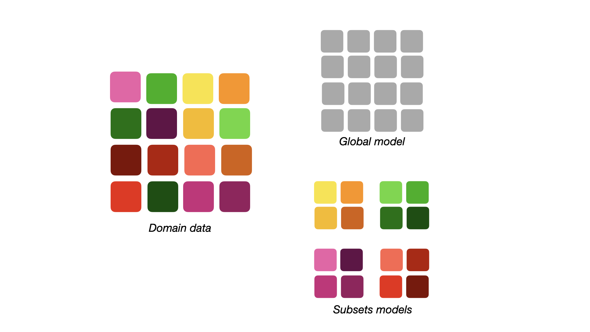 flowchart LR A[Domain data] --> G[Global Model] A --> C(Clustering) C --> K1[Subset model 1] C --> K2[Subset model 2] C --> Kn[Subset model k] G --> P1[Inference] K1 --> P2[Inference] K2 --> P2 Kn --> P2 P1 --> AC[Performance comparison] P2 --> AC